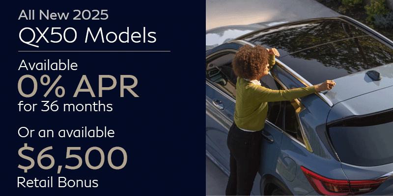0.0% APR financing for 36 months on new 2025 QX50 in retailer stock. Example: 10% down payment. 36 months financing at $27.78 per month per $1,000 financed at 0.0% for 36 months. Actual down payment may vary. Subject to residency restrictions. Subject to IFS credit approval. Not all buyers qualify. Retailer contribution may affect actual price set by retailer. Contact retailer for details. $6,500 Retail Bonus available to customers who purchase or lease a new 2025 QX50 from retailer stock. Offer not compatible with IFS special APR or IFS special lease offers. See your local Retailer for details.